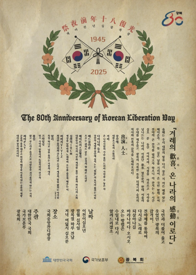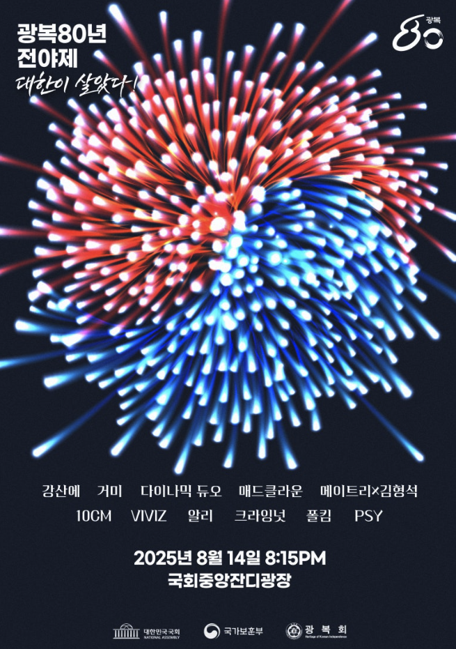 [대한민국 국회 X 국가보훈부 X 광복회가 함께하는 광복80년 전야제 - 대한이 살았다!] 뜻깊은 광복 무대 '광복절 전야제'가 국회 중앙잔디광장에서 펼쳐집니다. 독립운동 정신을 되새기며, 대한